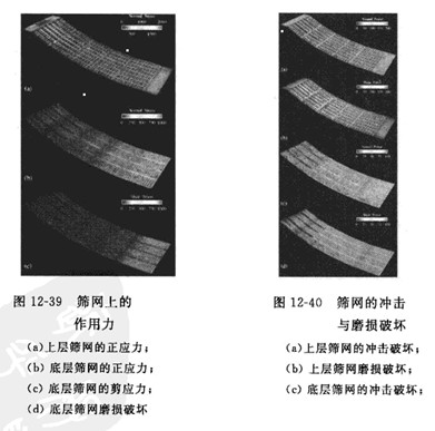 振動篩篩分的DEM仿真結(jié)果可以用于分析顆粒群再篩網(wǎng)上的松散度、振動強(qiáng)度、料層厚度、篩孔孔徑和篩面傾角等參數(shù)對分離粒度及篩分效率的影響及相互作用。顆粒群再篩網(wǎng)上的流動平衡、顆粒對篩網(wǎng)的沖擊速度計(jì)施加在篩網(wǎng)上的載荷也能通過DEM仿真結(jié)果獲得,從而確定篩網(wǎng)所受的應(yīng)力、篩網(wǎng)的磨損及篩分裝置的功率、圖12-39和圖12-40分別為Yuan等人通過DEM仿真獲得的篩網(wǎng)上的作用力圖和篩網(wǎng)的沖擊與磨損破壞圖。
